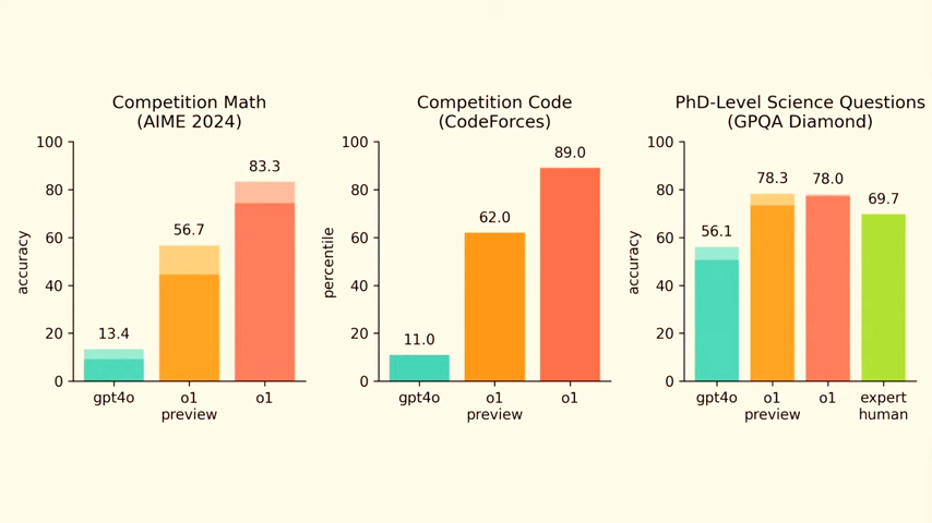 根据测试,OpenAI o1可以解决国际数学奥林匹克资格考试中83%的问题,而GPT-4o在该测试中的得分只有13%。在错误率方面,新模型出现重大错误的概率比预览版o1-preview减少了34%。